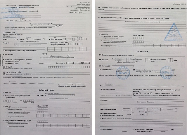 Санаторно-курортная карта оформляется на специальном, двухстороннем бланке. В официальном медицинском документе доктор указывает: